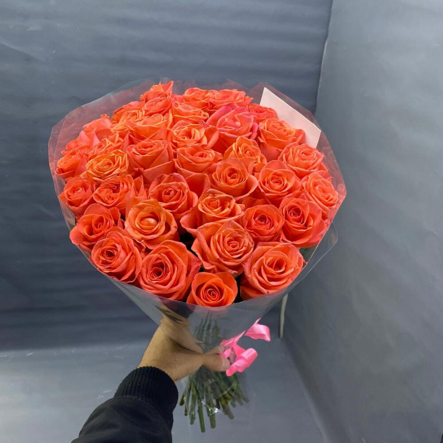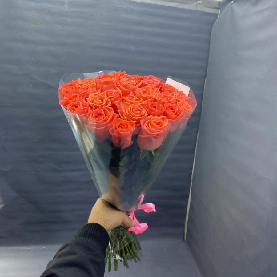 На фото букет из 29 коралловых роз. В составе: роза 29 шт, дизайнерская упаковка 1 шт, атласная лента 1 шт, . Все цветы свежие и ароматные, букет красиво оформлен и отлично подходит для подарка. Доступна доставка цветов или самовывоз.