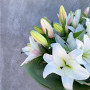 На фото букет из 5 лилий. В составе: лилия 5 шт, крафт-бумага 1 шт, атласная лента 1 шт, . Все цветы свежие и ароматные, букет красиво оформлен и отлично подходит для подарка. Доступна доставка цветов или самовывоз.