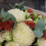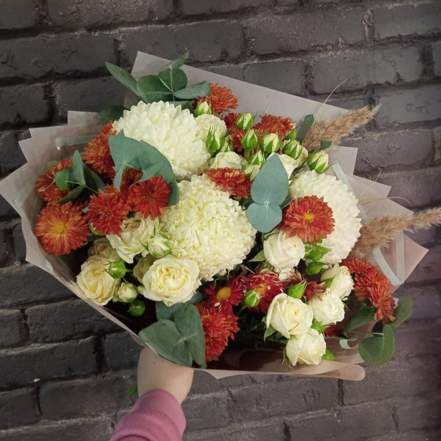 На фото букет из красных хризантем и роз. В составе: хризантема кустовая 3 шт, хризантема одноголовая 2 шт, кустовая роза 3 шт, крафт-бумага 1 шт, атласная лента 1 шт, . Все цветы свежие и ароматные, букет красиво оформлен и отлично подходит для подарка. Доступна доставка цветов или самовывоз.